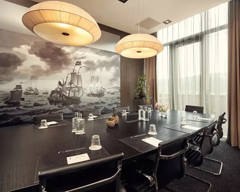 Een modern ingerichte boardroom met een vaste opstelling geschikt voor max. 10 personen. Voorzien van de laatste technologische voorzieningen.